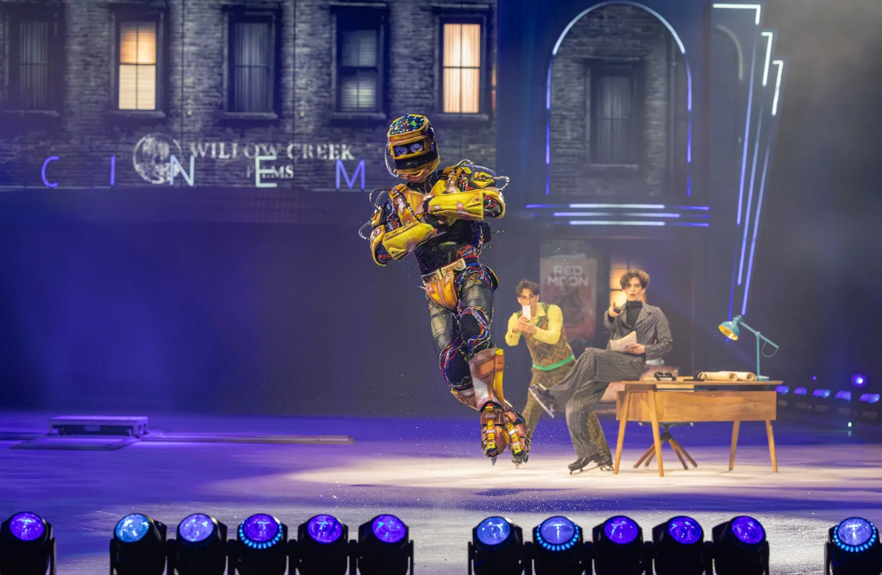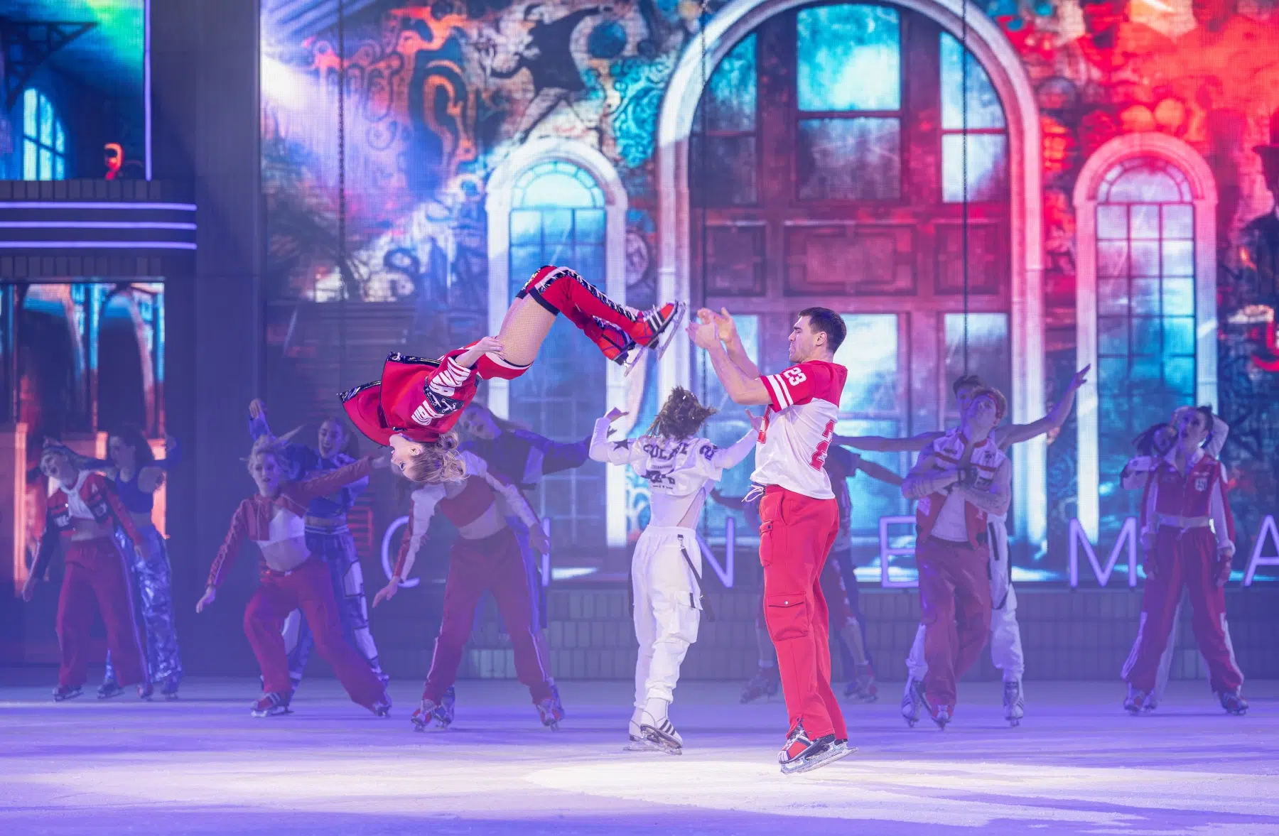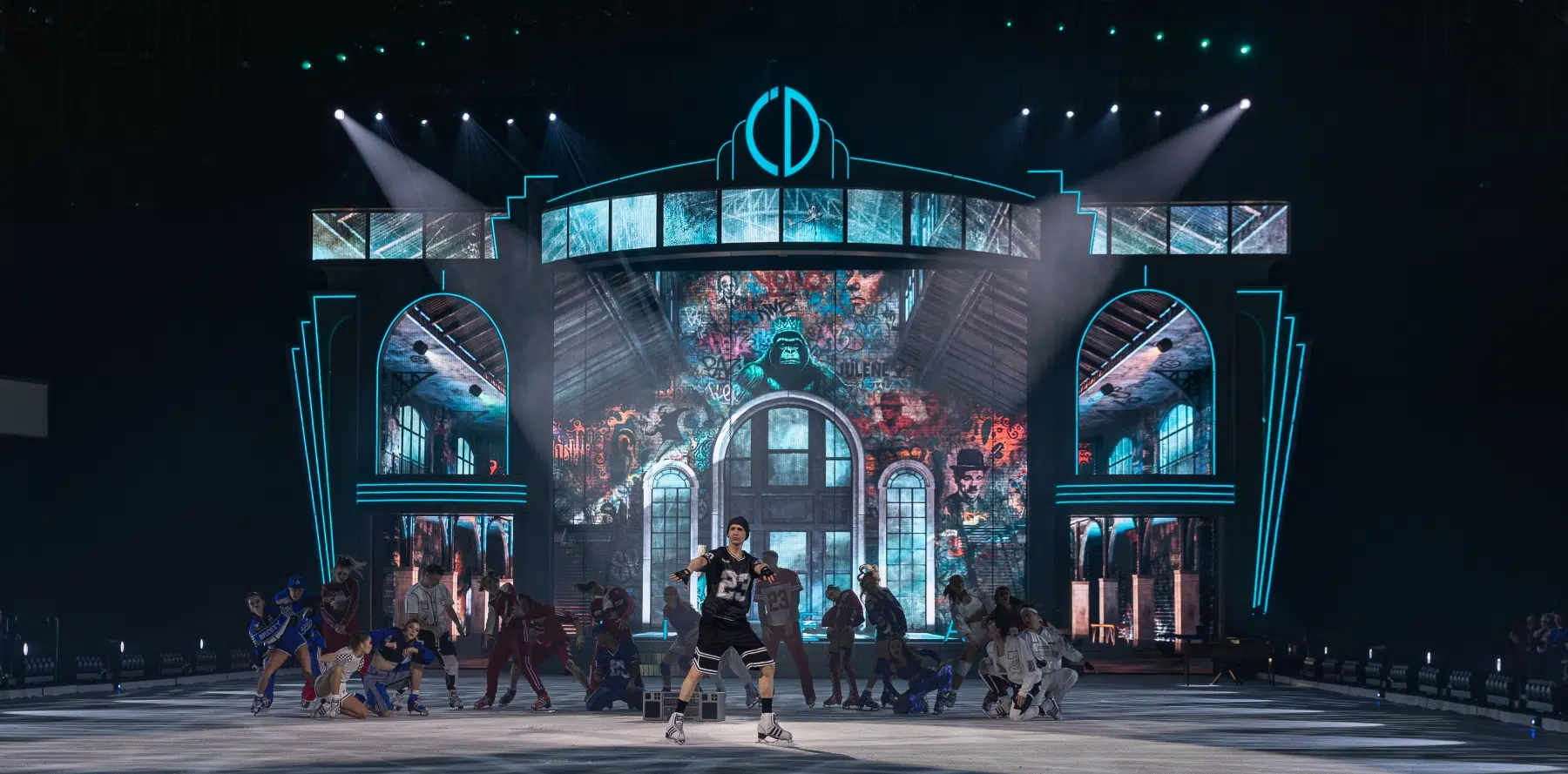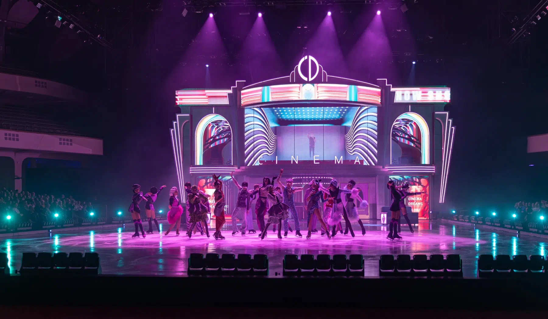Schon beim Betreten der Festhalle war klar: Cinema Of Dreams will mehr sein als eine klassische Eisshow. Ein imposantes Bühnenbild, raffinierte Lichtinstallationen und großflächige Projektionen verwandelten die Arena in ein lebendiges Filmstudio. Die Inszenierung folgt einer klaren dramaturgischen Linie – wie ein Episodenfilm auf Kufen, der das Publikum durch verschiedene Filmgenres führt: von romantischen Liebesgeschichten über rasante Actionsequenzen bis hin zu märchenhaften Fantasiewelten.