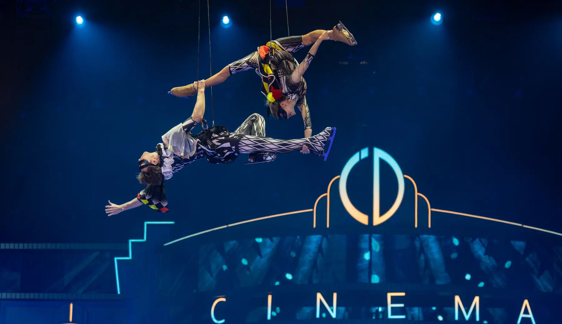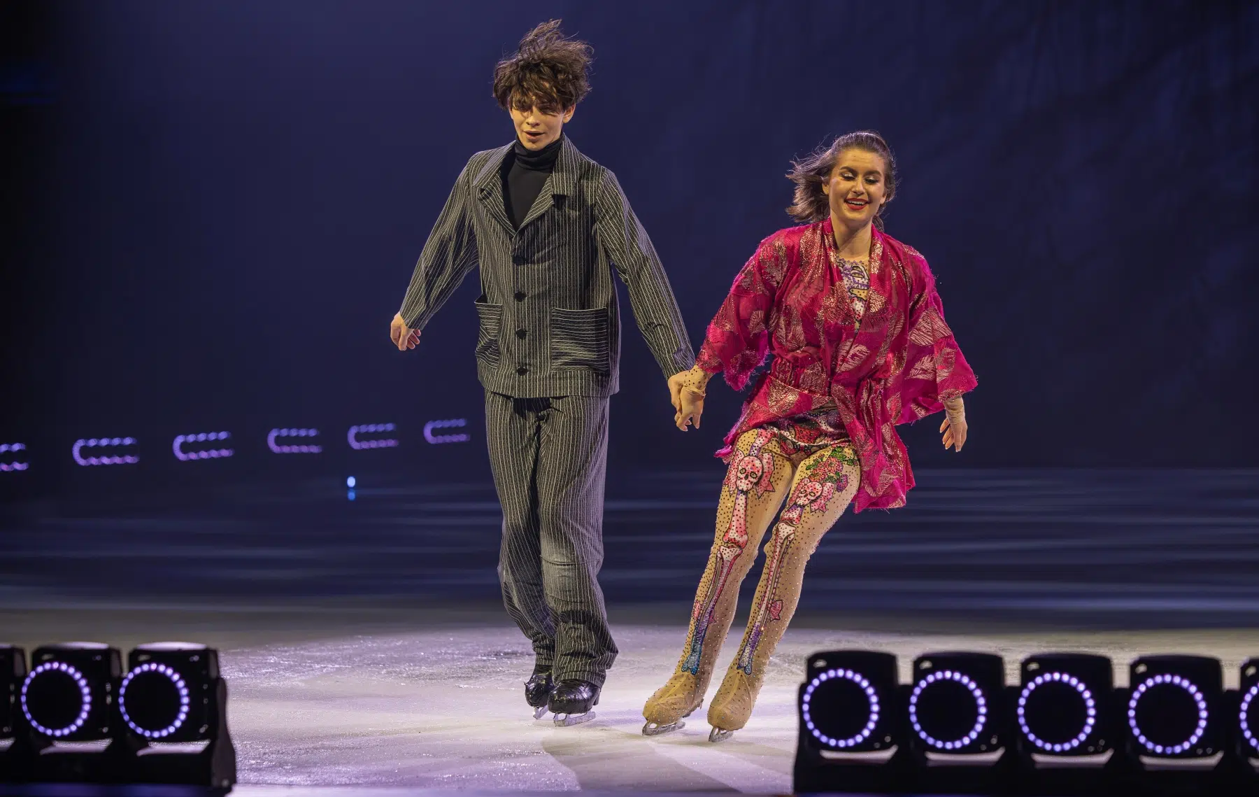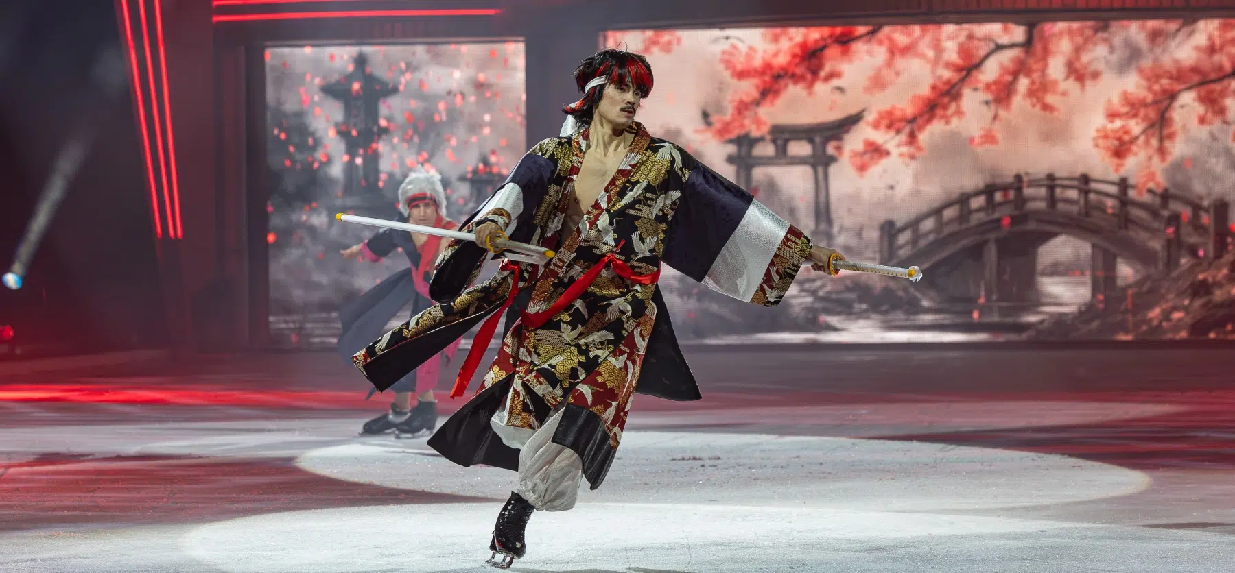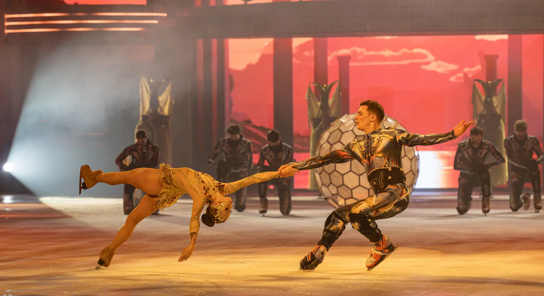 Schon beim Betreten der Festhalle war klar: Cinema Of Dreams will mehr sein als eine klassische Eisshow. Ein imposantes Bühnenbild, raffinierte Lichtinstallationen und großflächige Projektionen verwandelten die Arena in ein lebendiges Filmstudio. Die Inszenierung folgt einer klaren dramaturgischen Linie – wie ein Episodenfilm auf Kufen, der das Publikum durch verschiedene Filmgenres führt: von romantischen Liebesgeschichten über rasante Actionsequenzen bis hin zu märchenhaften Fantasiewelten.