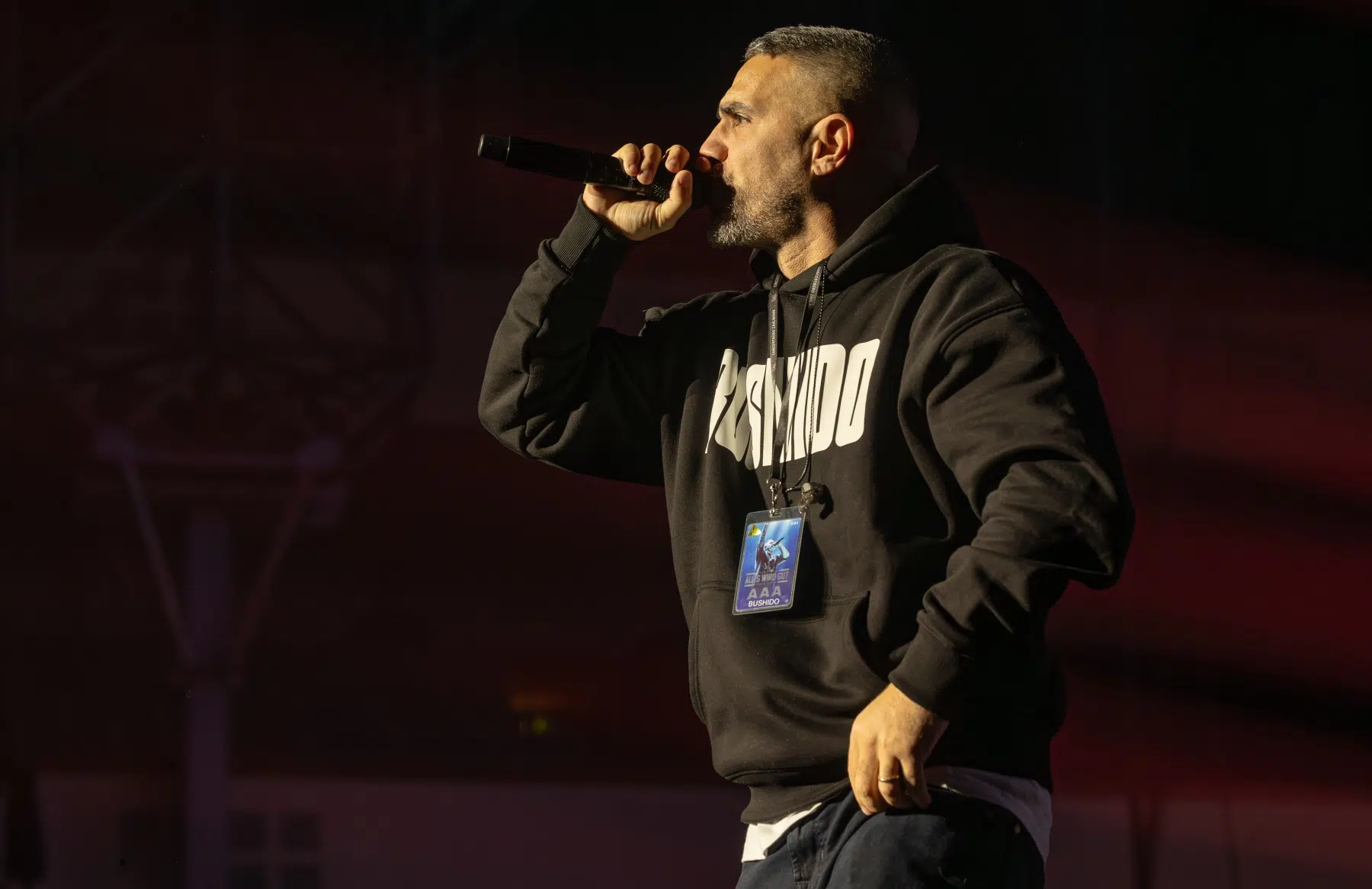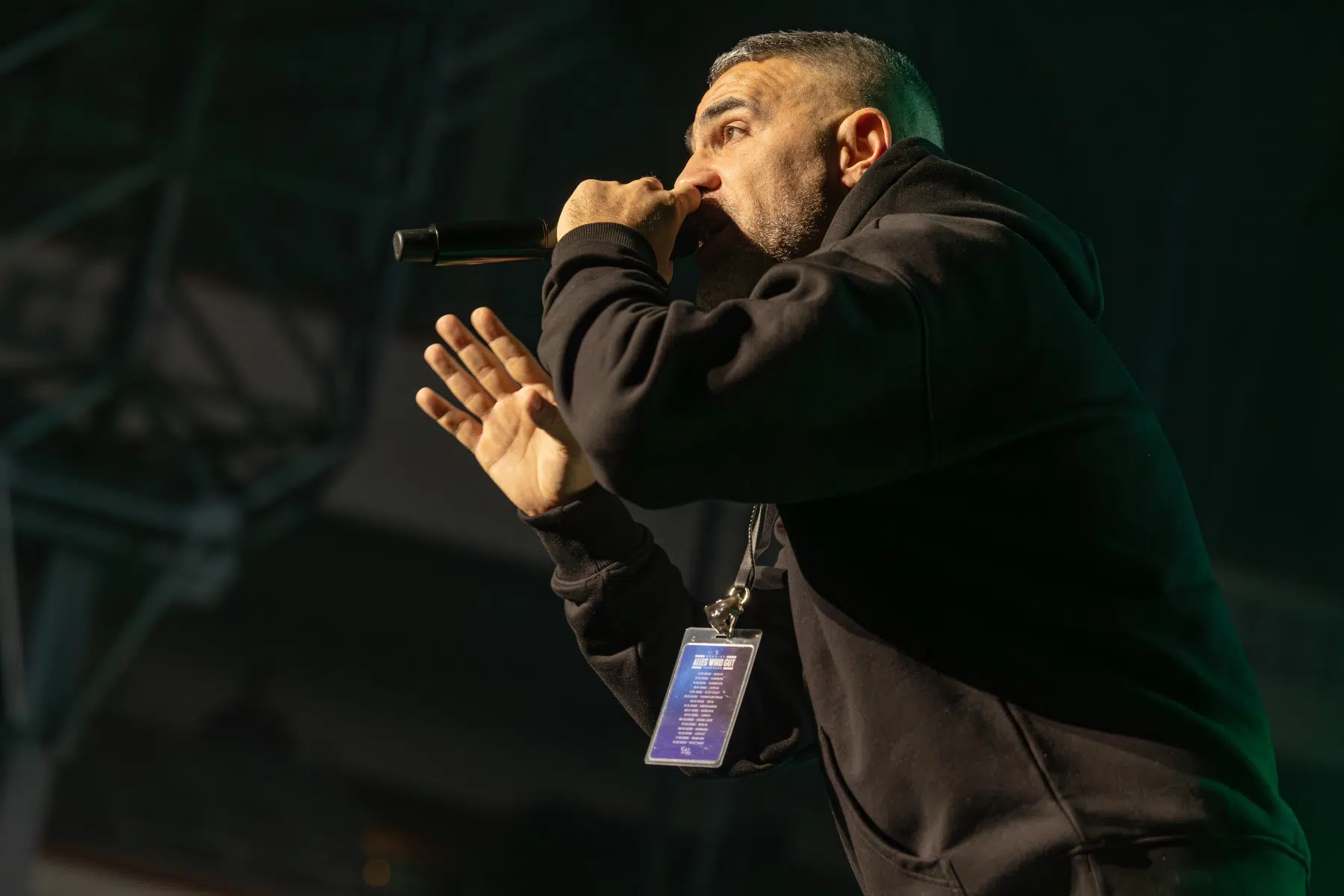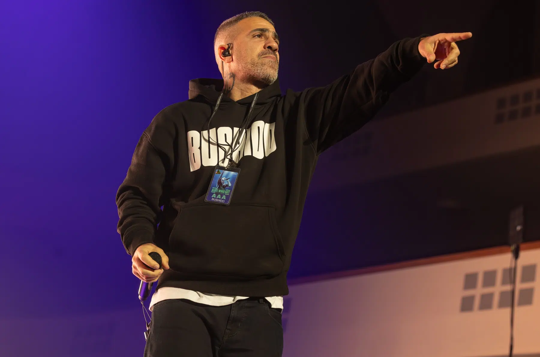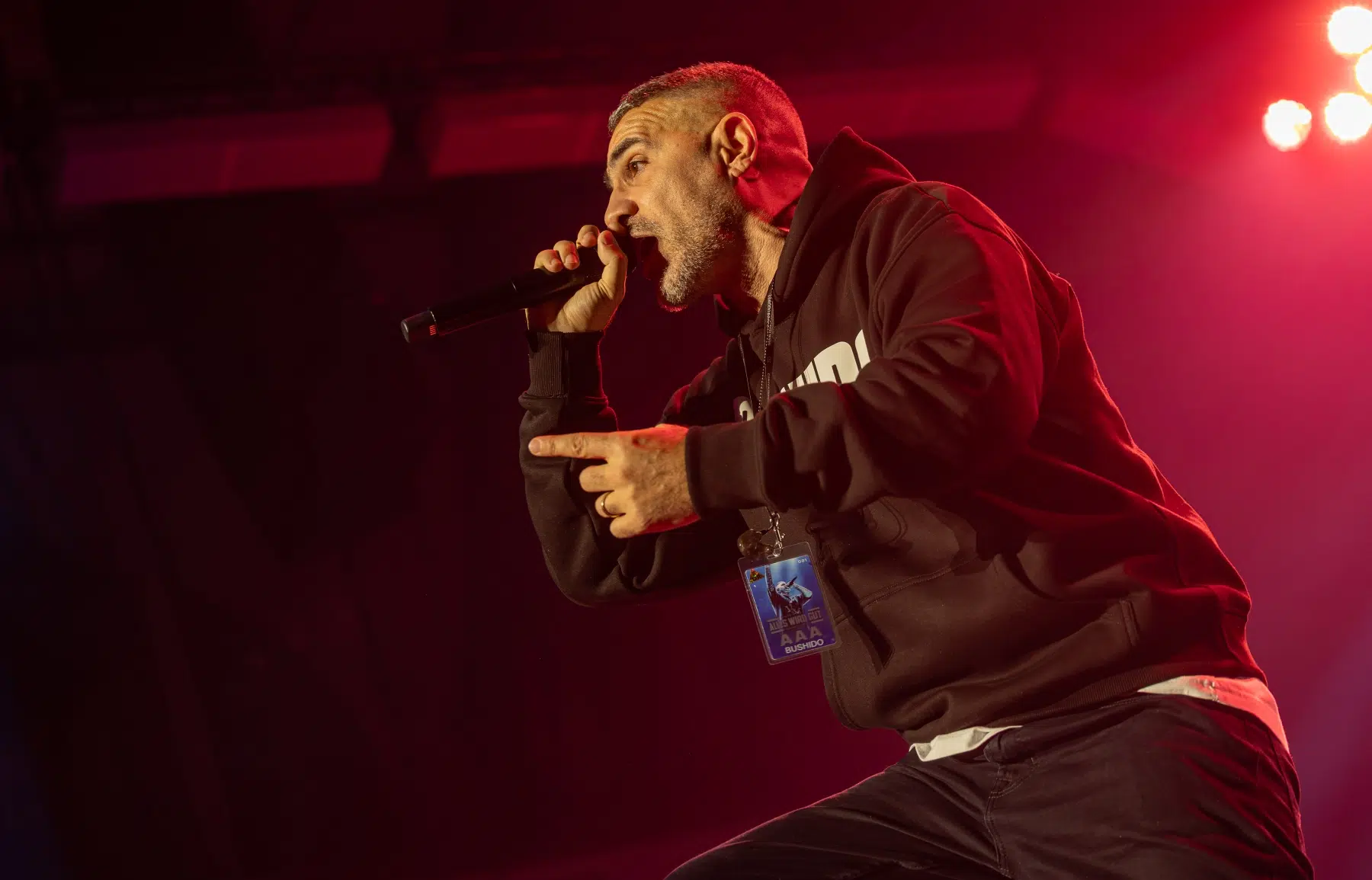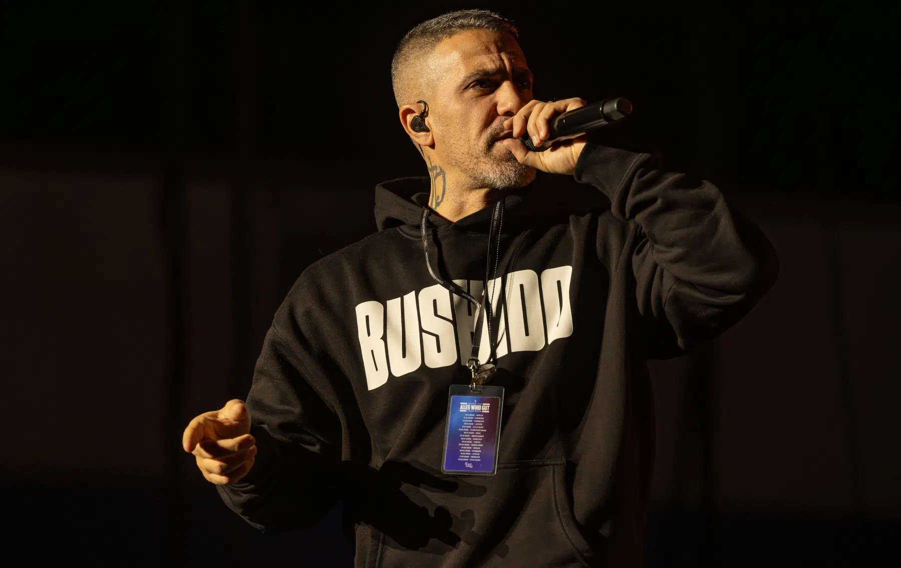 Der Abend beginnt mit einem Augenzwinkern und Symbolkraft: „Kleine Bushidos“ eröffnet das Set und schlägt sofort die Brücke zwischen Herkunft, Legacy und dem Blick zurück. Ohne lange Anlaufphase geht es mit „Wenn wir kommen“ und „Nie wieder“ direkt in die Konfrontation – hart, kompromisslos, laut. Die Halle ist von der ersten Minute an da.