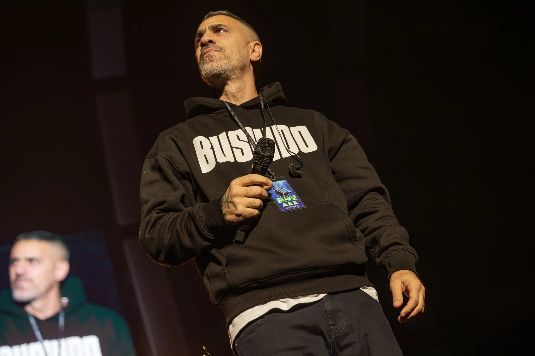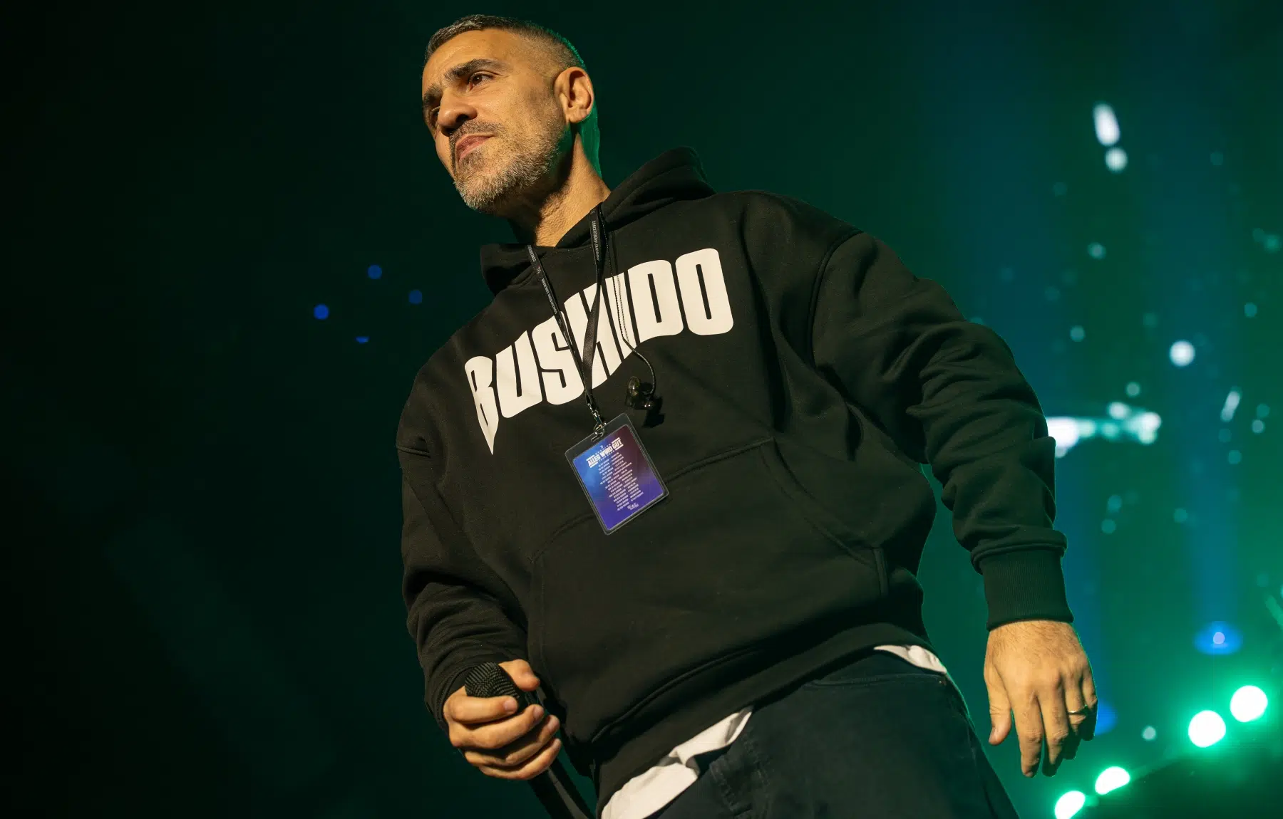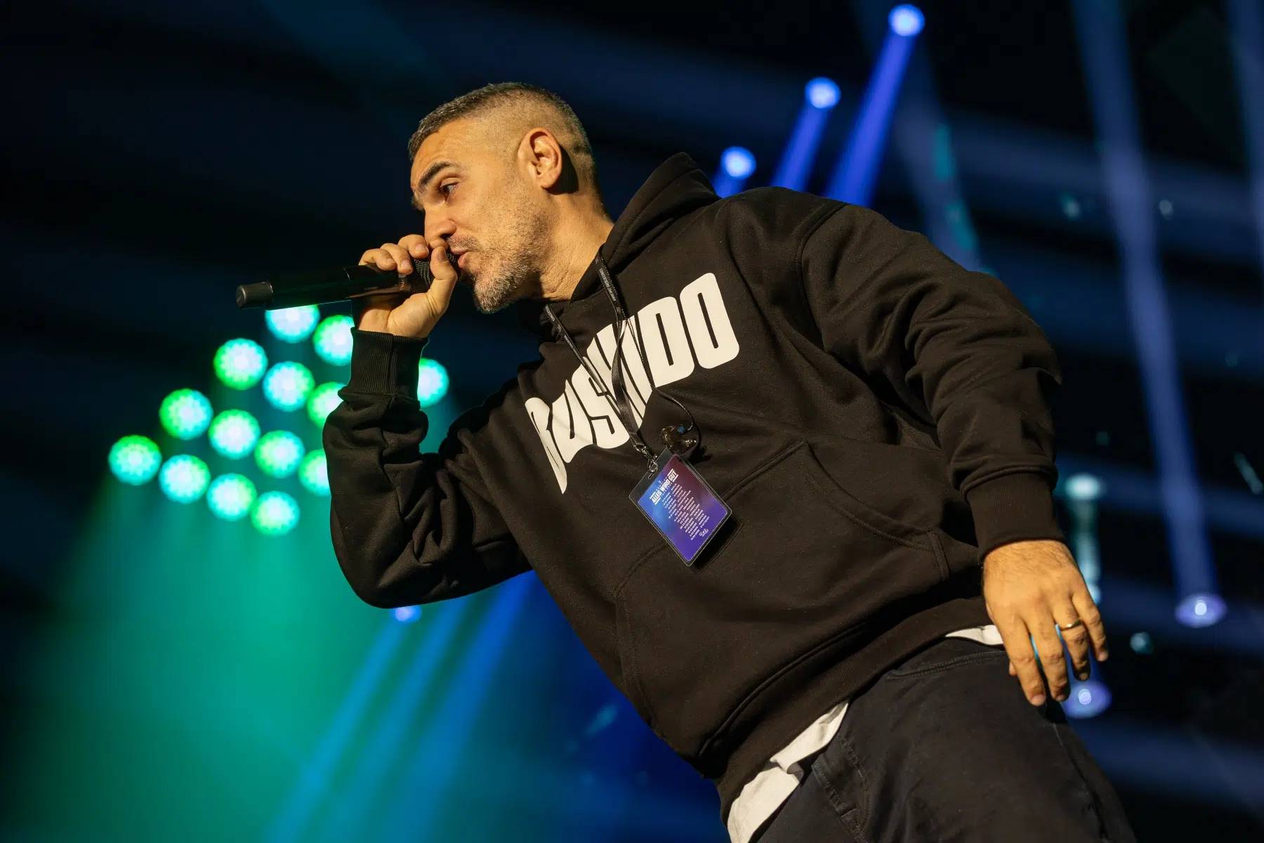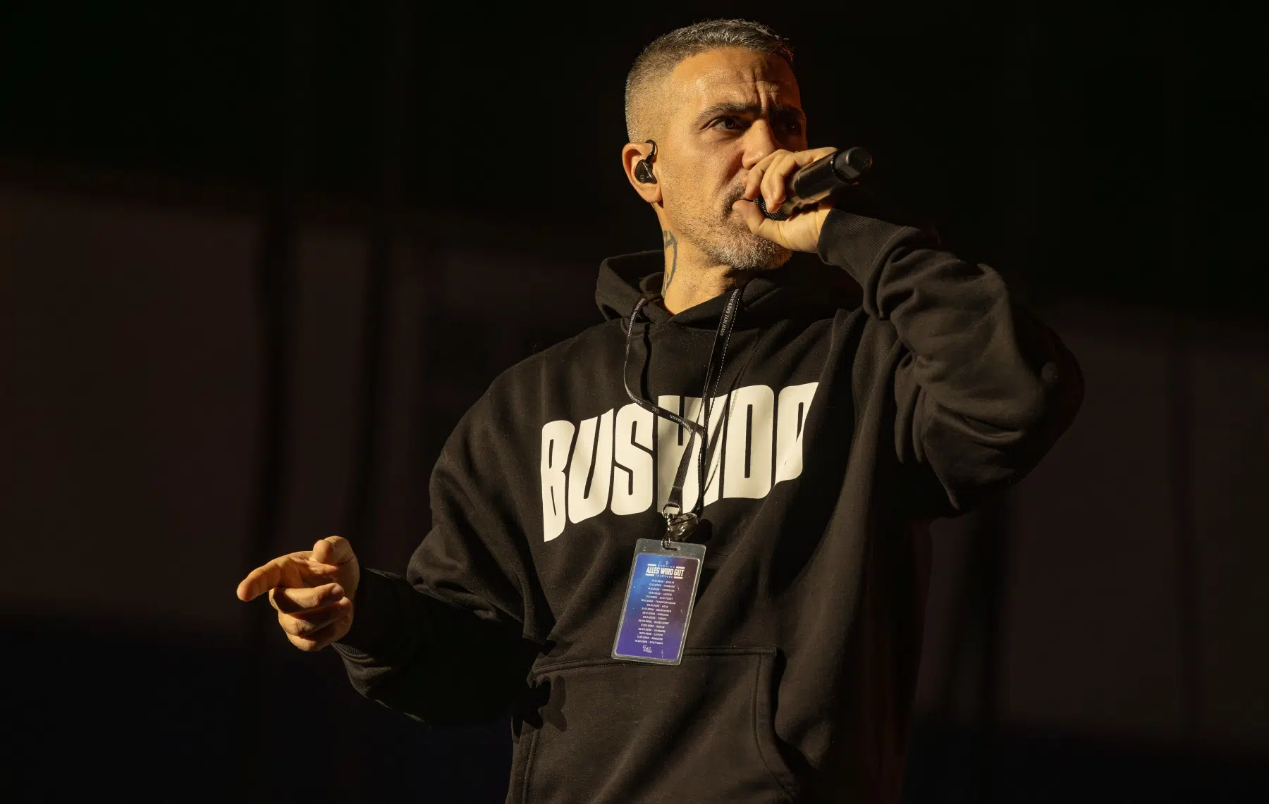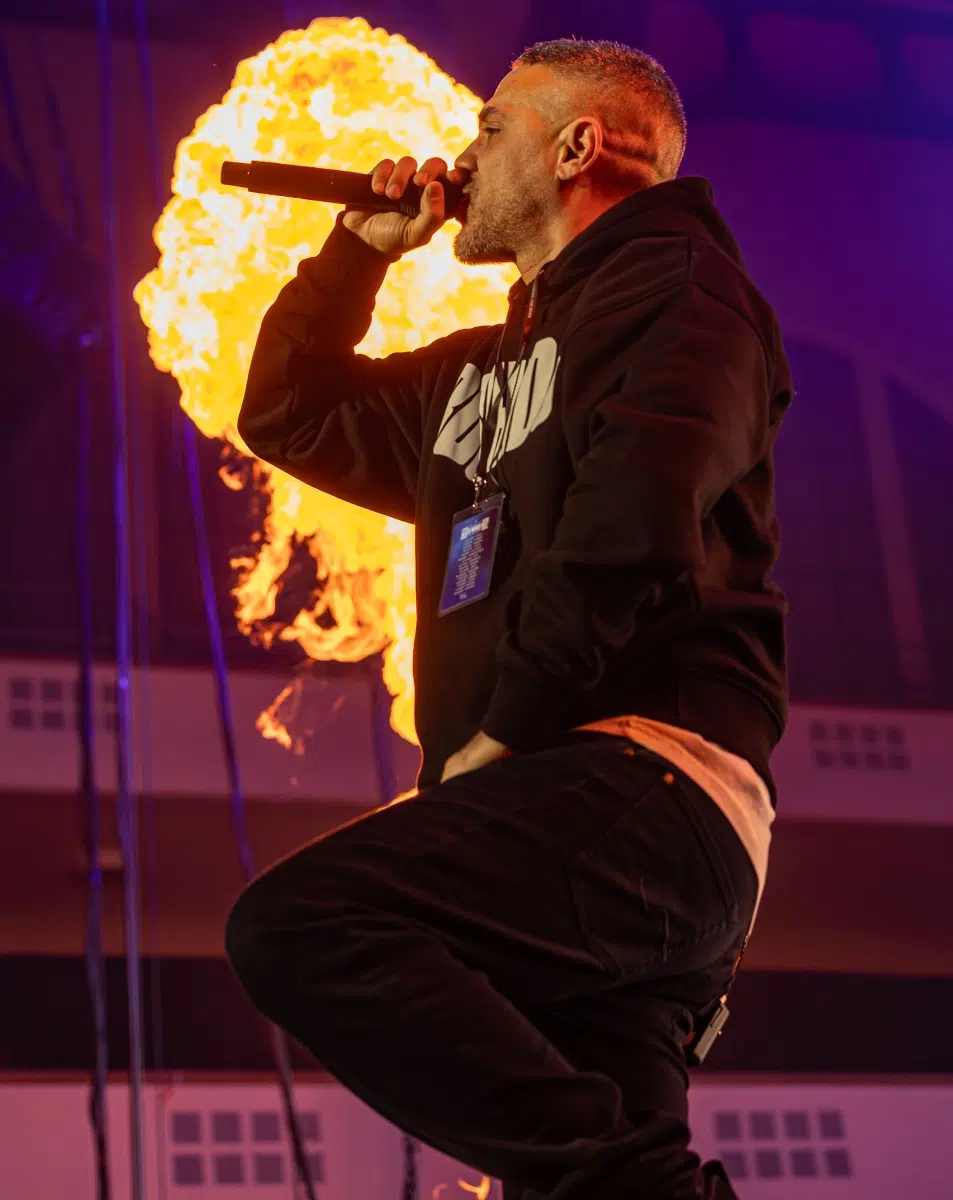 Der Abend beginnt mit einem Augenzwinkern und Symbolkraft: „Kleine Bushidos“ eröffnet das Set und schlägt sofort die Brücke zwischen Herkunft, Legacy und dem Blick zurück. Ohne lange Anlaufphase geht es mit „Wenn wir kommen“ und „Nie wieder“ direkt in die Konfrontation – hart, kompromisslos, laut. Die Halle ist von der ersten Minute an da.