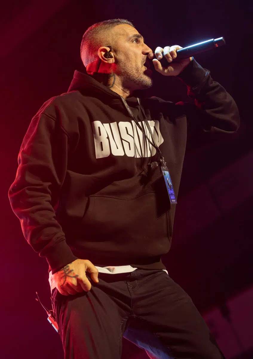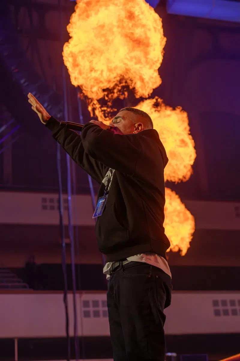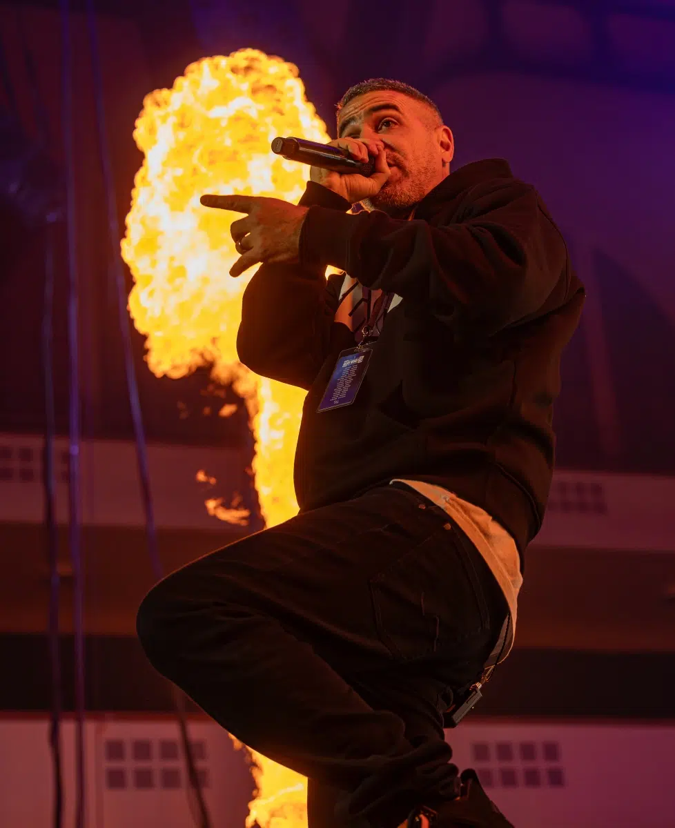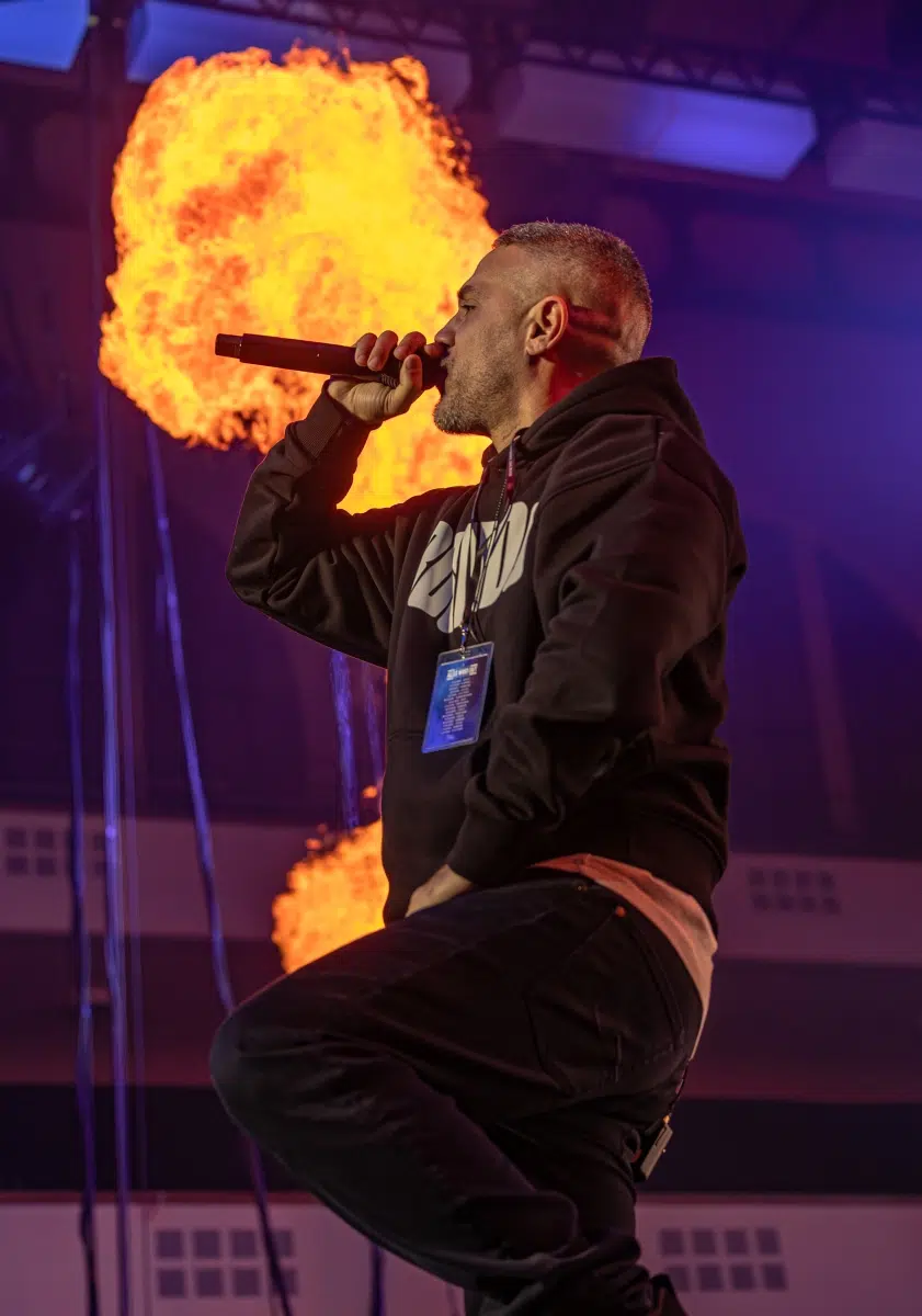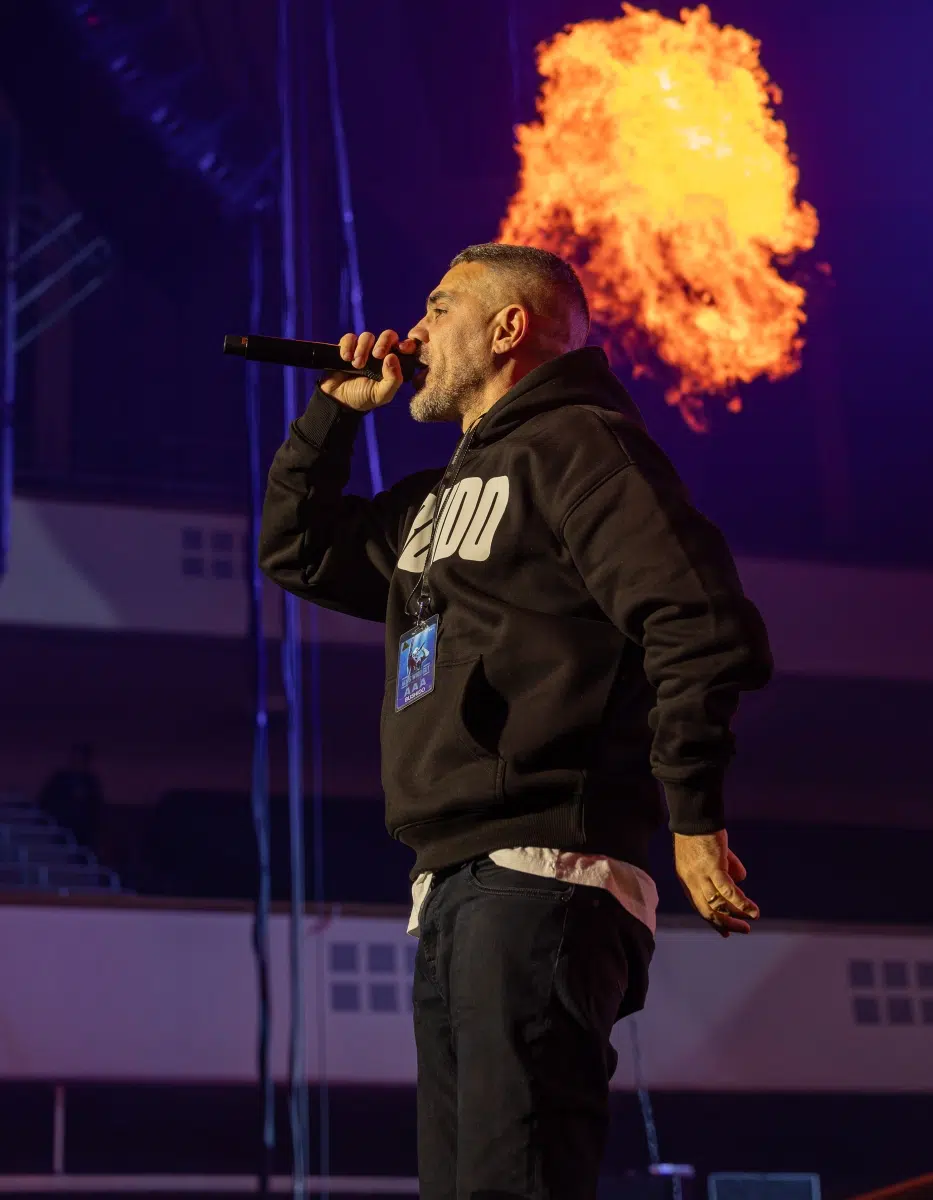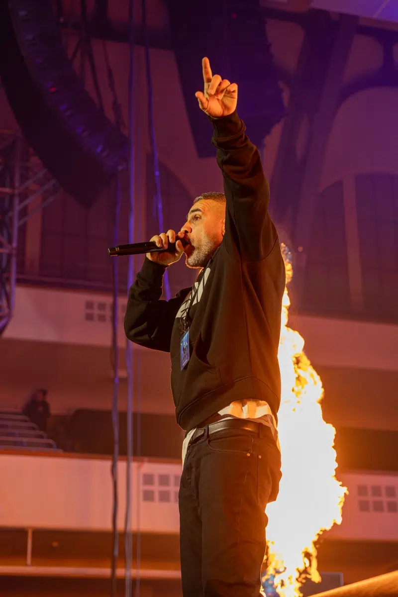 Ein emotionaler Höhepunkt folgt mit „Sonnenbank Flavour“, performt gemeinsam mit Fan Leon, der unter tosendem Applaus die Bühne betritt. Ein Moment, der zeigt, wie sehr Bushidos Musik Generationen geprägt hat. Klassiker wie „Von der Skyline zum Bordstein zurück“ und „Schmetterling“ lassen die Festhalle kollektiv in Erinnerungen versinken.