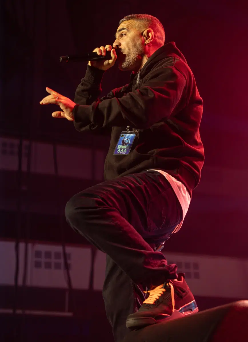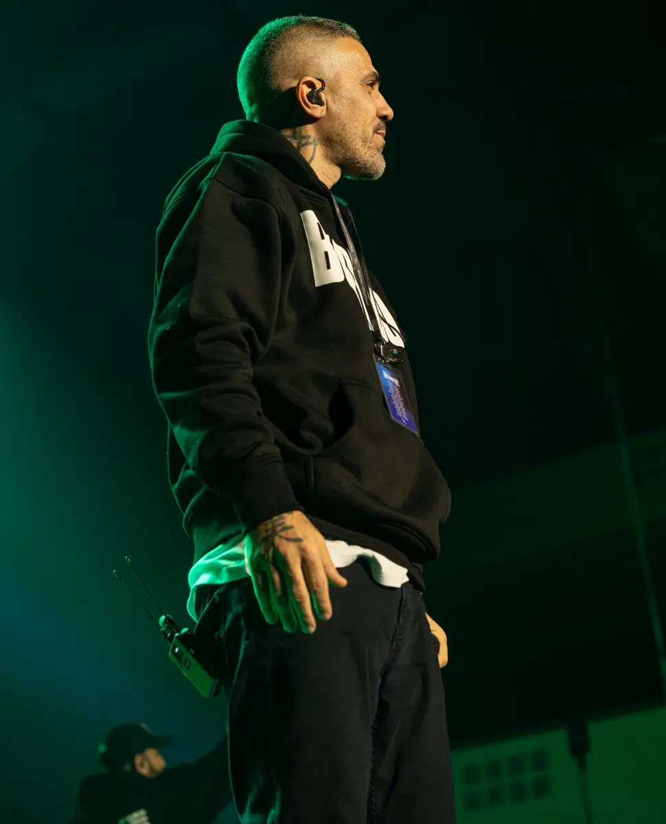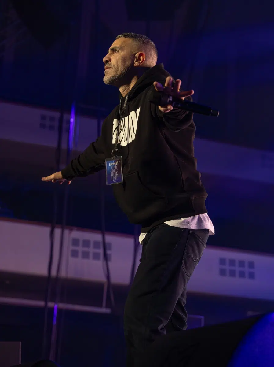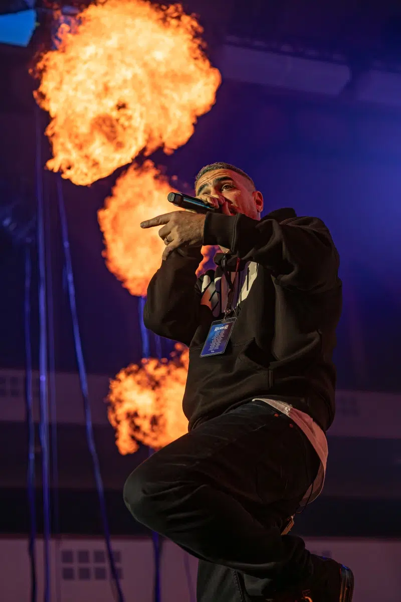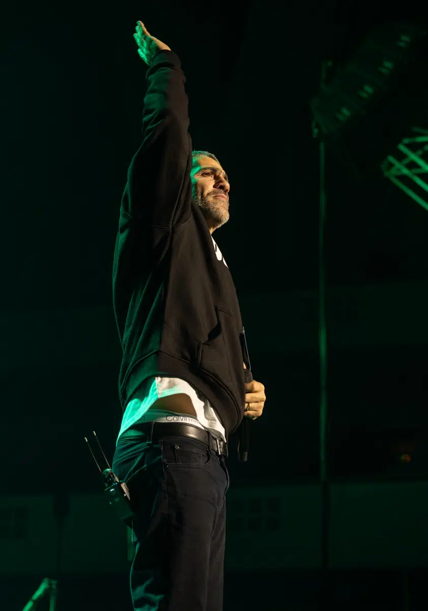 Ein emotionaler Höhepunkt folgt mit „Sonnenbank Flavour“, performt gemeinsam mit Fan Leon, der unter tosendem Applaus die Bühne betritt. Ein Moment, der zeigt, wie sehr Bushidos Musik Generationen geprägt hat. Klassiker wie „Von der Skyline zum Bordstein zurück“ und „Schmetterling“ lassen die Festhalle kollektiv in Erinnerungen versinken.