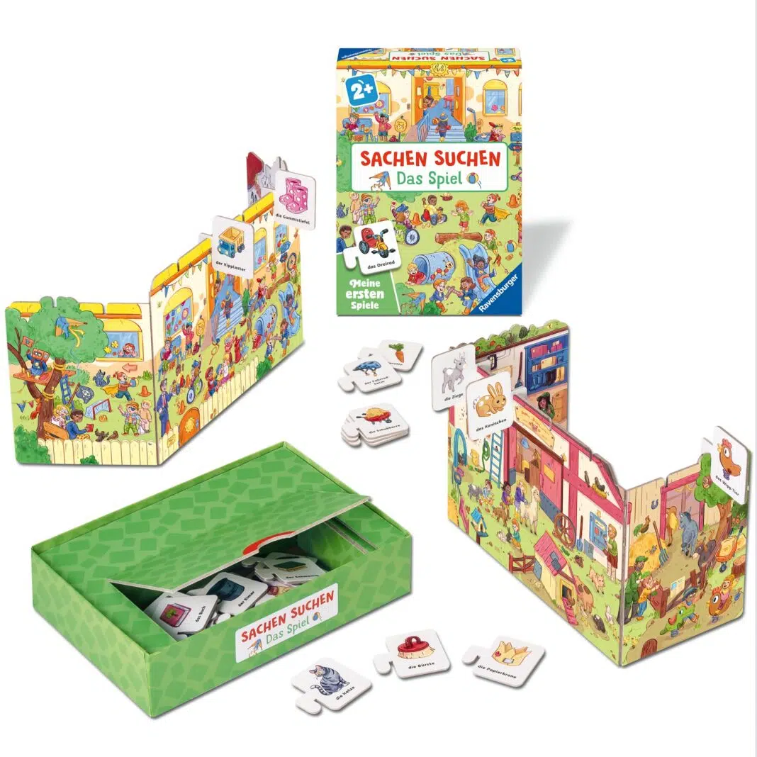 Das Spiel zur erfolgreichen Buchreihe: Genau wie in den Bilderbüchern heißt es hier für Kinder ab zwei Jahren, bestimmte Gegenstände in zwölf kleinen Geschichten wiederzufinden. In der Kita vermisst zum Beispiel Mia ihre Krone, Elias braucht einen Schwamm und Lauras Mama hat ihren Helm vergessen. Auch draußen ist viel los, und ein Ausflug zum Streichelzoo wird zum besonderen Spaß. Ob im freien Spiel oder nach ersten Regeln: „Sachen suchen“ fördert Sprachentwicklung und Motorik der Kinder und wurde aus hochwertigem und stabilen Material speziell auf die Bedürfnisse von Klein- und Vorschulkindern entwickelt. Ein schönes Geschenk für kleine Spürnasen!