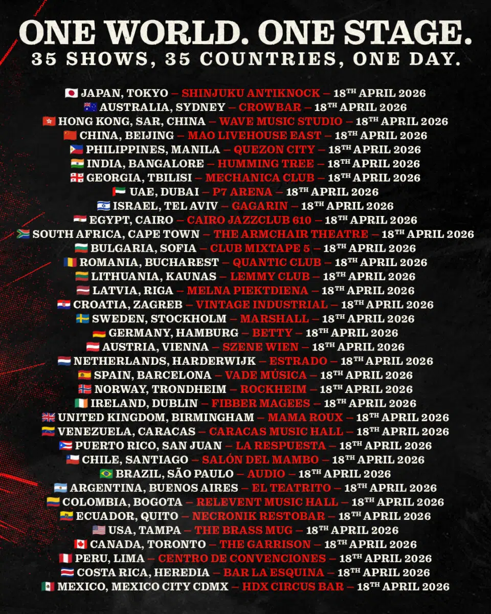Am 18. April bringen 35 Wacken-Warm-Up-Konzerte den Globus zum Beben! Von der ersten Show in Japan bis zur letzten in Mexiko werden fast 24 Stunden vergehen – alle gefüllt mit bestem Heavy Metal und feiernden, vereinten Fans. Ein Live-Erlebnis getragen vom legendären Wacken-Spirit.