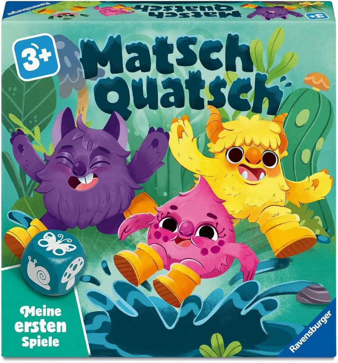 Alle lieben es in Matschpfützen zu springen. In Matsch-Quatsch schlüpfen die Kinder daher entweder in die Rolle der Quatsch-Monster oder sie unterstützen „den Matsch“. Werden es die Monster schaffen, auf die andere Seite des matschigen Pfads zu gelangen, oder wird es dem Matsch gelingen die Monster in den tiefen Pfützen verschwinden zu lassen? Der imposante 3D-Aufbau und ein wahlweise kooperativer oder kompetitiver Spielmodus fördern bei kleinen Abenteurern erstes Regelverständnis, Aufmerksamkeit und Teamgeist. Das Spiel aus der Reihe „Meine ersten Spiele“ besteht aus besonders robustem Material in Ravensburger Qualität und ist damit sehr gut für Klein- und Vorschulkinder geeignet.