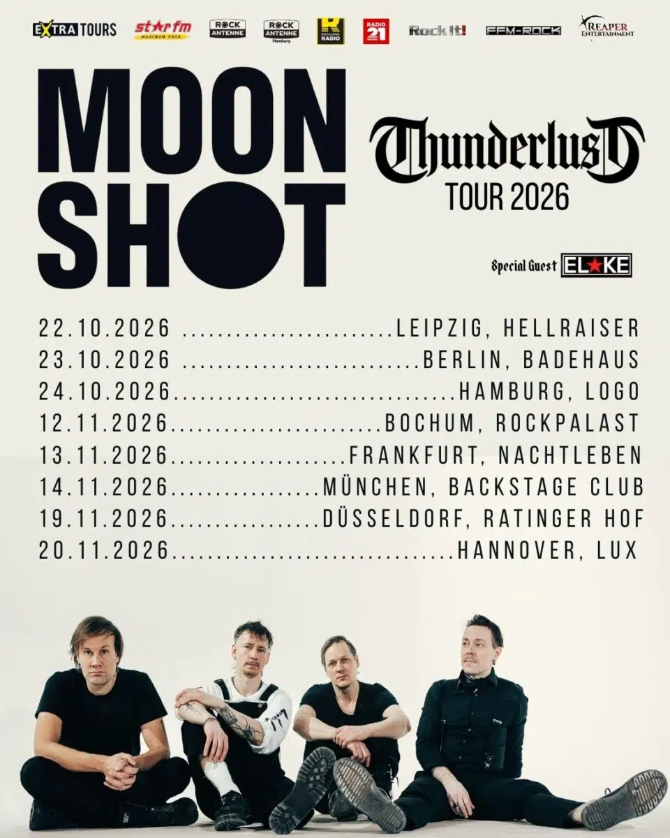 Passend zur Veröffentlichung bringen Moon Shot ihr neues Album im Herbst 2026 auf die Straße – die Thunderlust Tour 2026 wird zur direkten, ungefilterten Begegnung zwischen Band und Publikum.