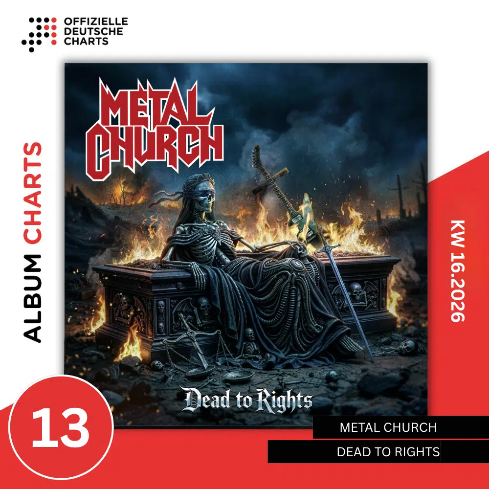Die US-Thrash-Metal-Legenden Metal Church feiern einen weiteren Meilenstein in ihrer beeindruckenden Karriere: Ihr aktuelles Studioalbum Dead To Rights ist heute offiziell in die deutschen Albumcharts eingestiegen – auf Platz 13.Das ist das beste Chartergebnis der Band in Deutschland!