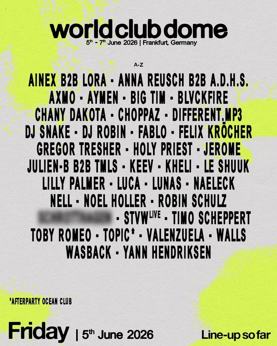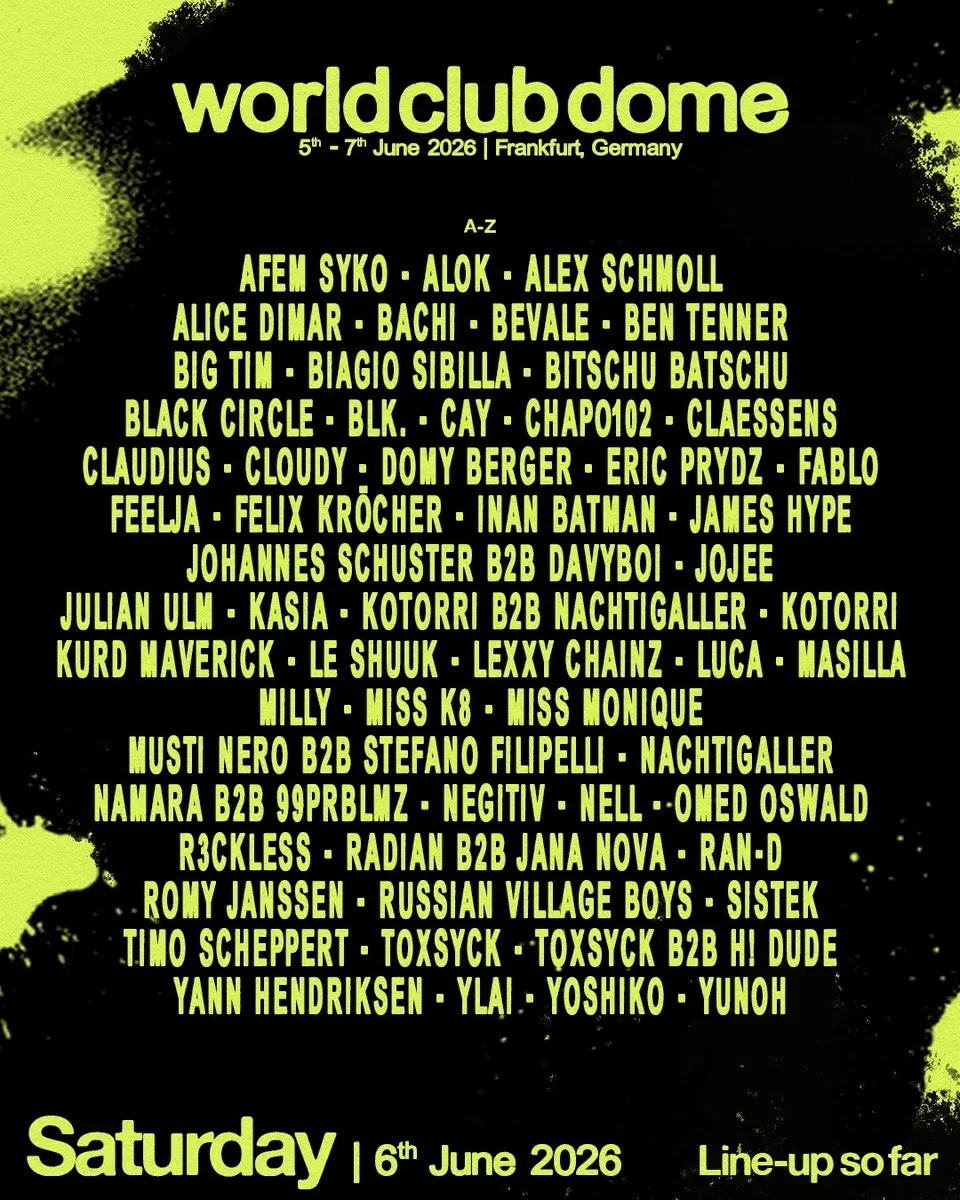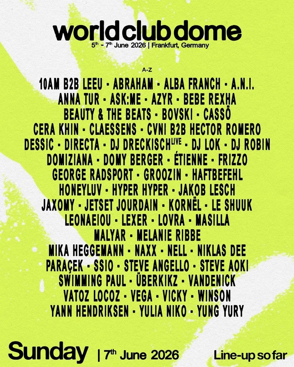 Der WORLD CLUB DOME in Frankfurt – vom DJ Mag UK als bestes Festival Deutschlands und Nr. 11 weltweit ausgezeichnet – verwandelt den Deutsche Bank Park alljährlich in die größte Clubfestival-Location der Welt. Für die 12. Ausgabe, die vom 05. bis 07. Juni 2026 stattfindet, stehen nur die aktuellen Line-Ups der einzelnen Festivaltage fest.