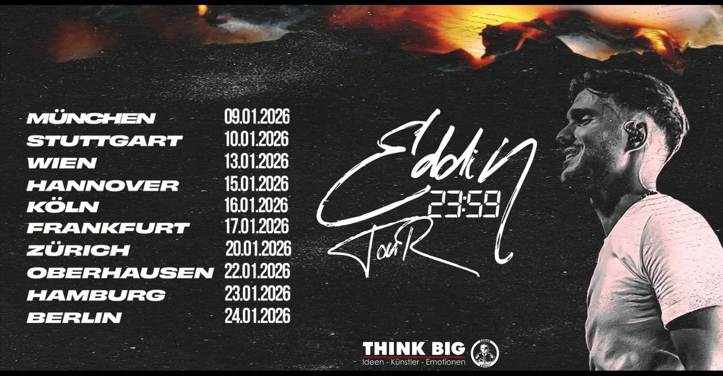 Nach einer erfolgreichen ersten Tour mit fast 10.000 begeisterten Fans meldet sich Eddin 2026 mit einer neuen Tour zurück. Diesmal stehen 10 Stopps in Deutschland, Österreich und der Schweiz auf dem Plan, und die Fans dürfen sich auf eine Liveshow freuen, die seine musikalische Entwicklung der letzten Monate perfekt widerspiegelt.