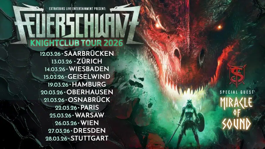 Nach einer weitestgehend ausverkauften Hallentournee 2024 kommen Feuerschwanz mit ihrem jüngsten Album „Knightclub“ nun erneut auf Tournee. Nomen est omen – schließlich ist die Band schon immer für wilde Partynächte und heiße Shows bekannt! So liefert „Knightclub“ einmal mehr eine hinreißende Mischung aus eingängigen Hooks, knallharten Metal-Riffs und dem typischen Humor der Band. Gastauftritte von Doro Pesch, Dag-Alexis Kopplin (SDP) und Lord of the Lost sorgen für zusätzliche Power, während Tracks wie die beim Eurovision Song Contest getestete Titelsingle „Knightclub“, das epische „Valhalla“ und ihre Coverversion von „Gangnam Style“ beweisen, warum Feuerschwanz an der Spitze des modernen Folk- und Mittelalter-Metal stehen.