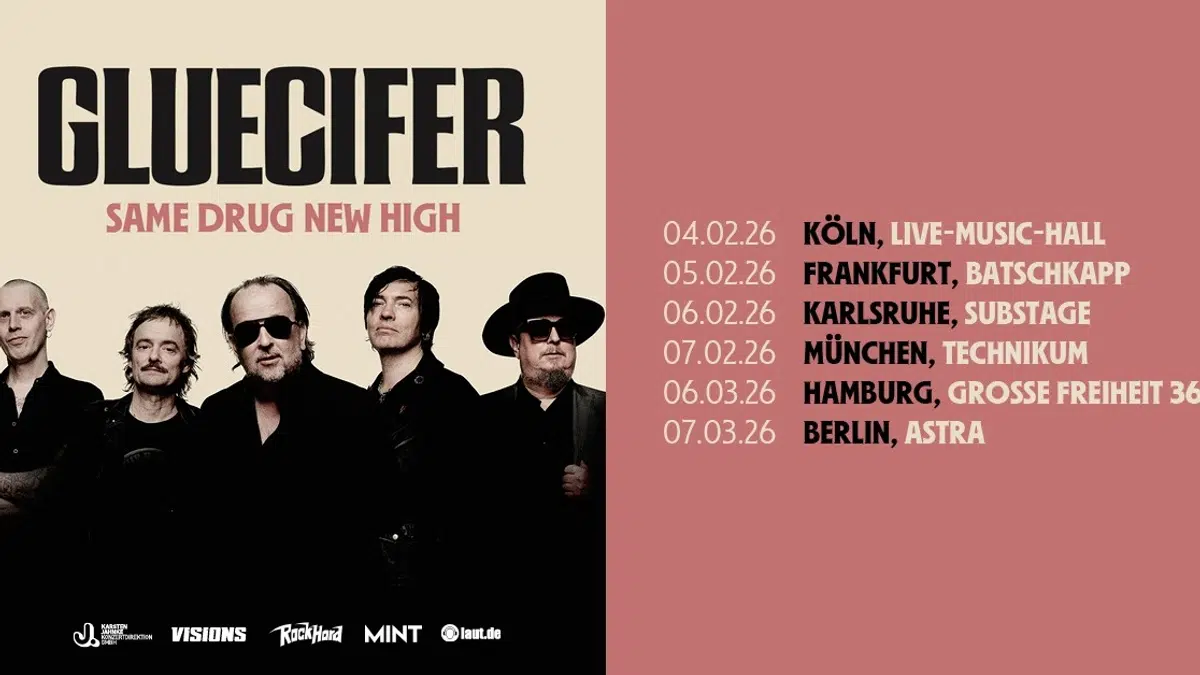 „Rock’n’Roll never died, it just passed out in the corner“ (Rick Sims, The Didjits)– selten hat ein Zitat besser zu einer Band gepasst als zu GLUECIFER. Mit ihrem neuen Album “Same Drug New High” melden sich die norwegischen Rock-Helden zurück und schlagen ein neues Kapitel in ihrer Geschichte auf. Natürlich dürfen ihre Fans sich neben neuer Songs auch über neue Shows der Band freuen, deren Bühnenpräsenz und Energie nach wie vor legendär ist: Im Februar und März 2026 kommen GLUECIFER für sechs Shows nach Deutschland und spielen in Köln, Frankfurt, Karlsruhe, München, Hamburg und Berlin.
