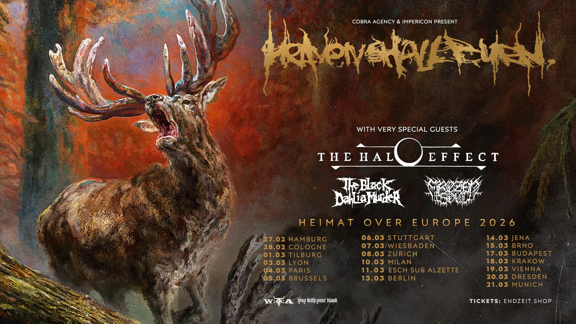Nach einer intensiven Festivalsaison kehren Heaven Shall Burn im März nun in die europäischen Clubs zurück und präsentieren ihr neues Album „HEIMAT“, auf dem sie ihren Trademark-Sound zwischen Metalcore und melodischem Death Metal noch einmal neu bündeln. Die Abenteuerreise komplettieren Städte, die man zum Teil noch nie gespielt hat, wie z.B. Krakow, Brno oder auch Dublin. Schönerweise machen sie aber auch erneut bei uns Station. Willkommen zurück. Ebenso schön ist, dass sie dies auch diesmal nicht allein tun, sondern sich mit The Halo Effect aus Göteborg, The Black Dahlia Murder aus Michigan und Frozen Souls aus Texas gleich drei weitere zwischen modern und oldschool oszillierende Death Metal-Walzen dazu eingeladen haben. Das Schlusswort hat Heaven Shall Burns Maik Wichert: „Wir sind richtig heiß darauf endlich mit unserer neuen Scheibe HEIMAT durch Europa zu ziehen und Euch die neuen Songs um die Ohren zu hauen! Wir haben ein fettes Paket geschnürt, mit Bands von denen auch wir riesige Fans sind, das solltet Ihr nicht verpassen, es wird der totale Abriss!“ Recht hat er, der Mann.