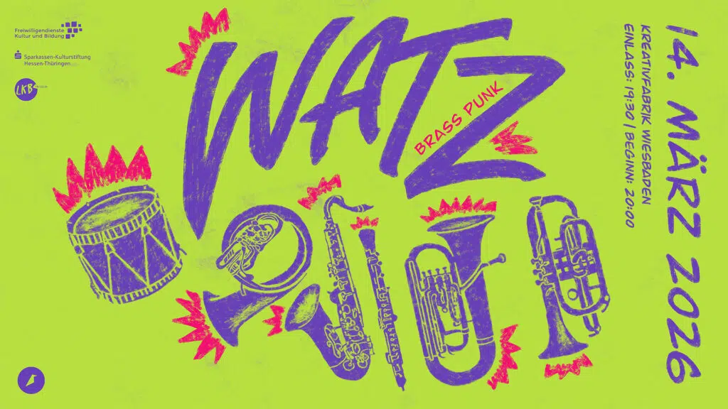 WATZ sind eine Band aus aktuell neun Menschen, jeder Menge Blech- und Holzblasinstrumenten und Drums. Zwischen Melodien und Gebratze, mal lau, mal leiser, ein wilder Chaos-Mix aus Brass, Punk, Elektro, Pop, Disco quer durch die Galaxie.
