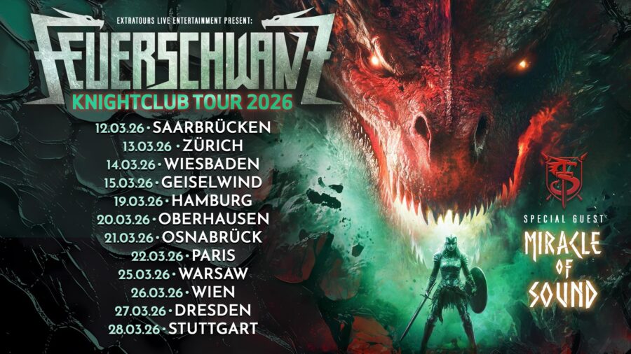 Nach einer weitestgehend ausverkauften Hallentournee 2024 kommen Feuerschwanz mit ihrem jüngsten Album „Knightclub“ nun erneut auf Tournee. Nomen est omen – schließlich ist die Band schon immer für wilde Partynächte und heiße Shows bekannt! So liefert „Knightclub“ einmal mehr eine hinreißende Mischung aus eingängigen Hooks, knallharten Metal-Riffs und dem typischen Humor der Band. Gastauftritte von […]